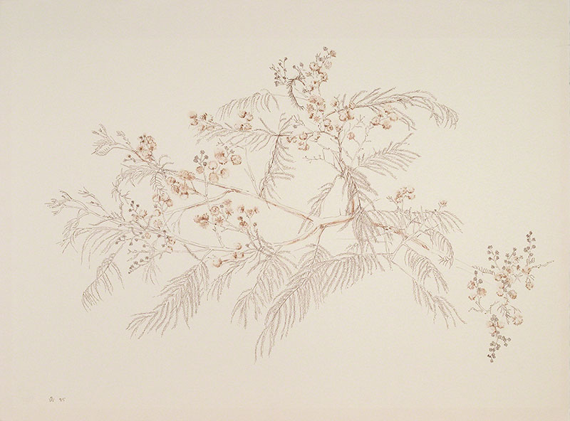 The artist works in a variety of drawing media: pen and ink, ballpoint, brush, crayon, chalk, pastel, conté, and charcoal. Recently she has developed mixed media techniques in silverpoint and goldpoint.