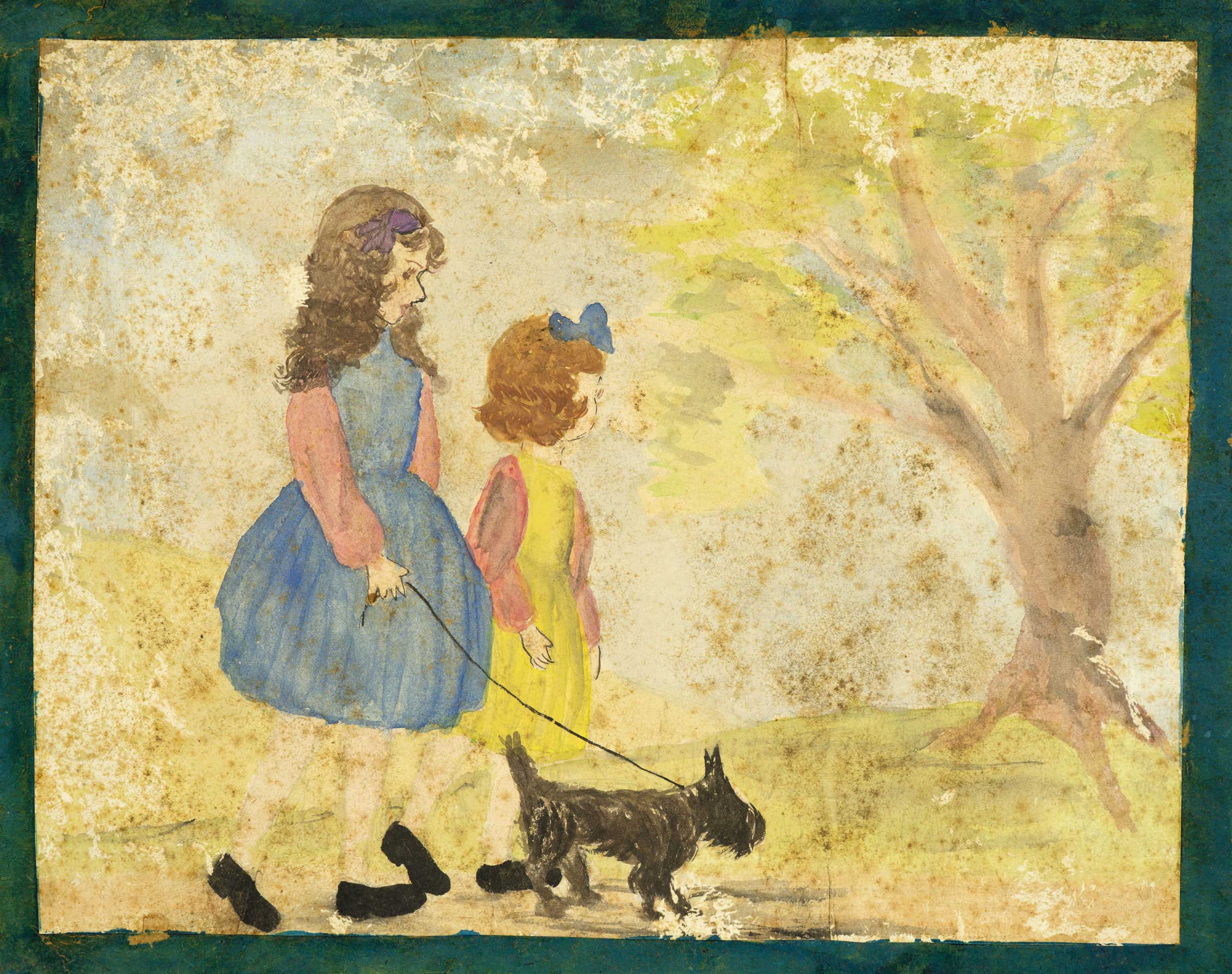 Two girls walking dog in park 1954
