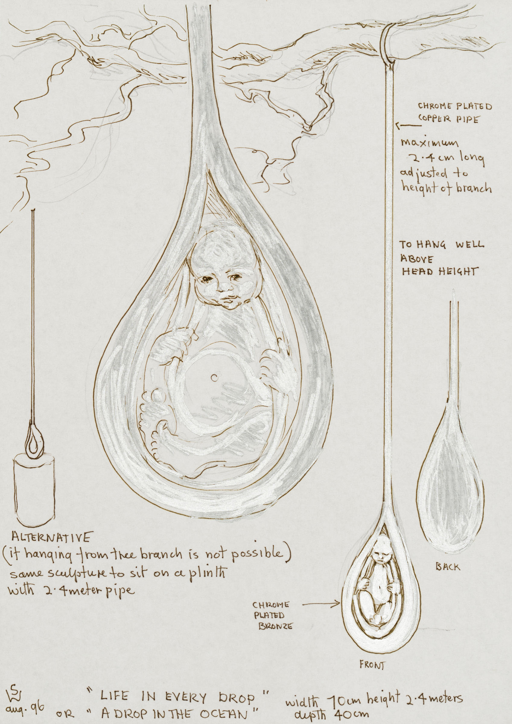 Sketches of two proposals: Reflections in the water (corrugated metal, ca. 2 m high) and Life in every drop (chrome-plated bronze, 2.4 m high)