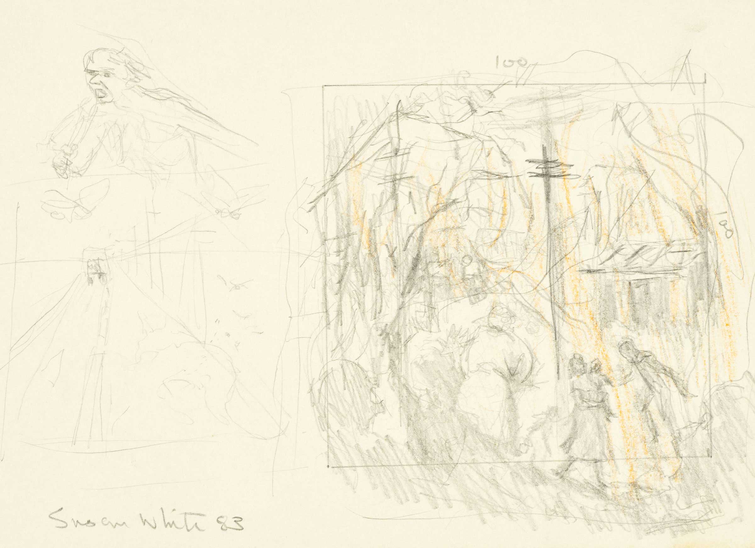 Bushfire, fleeing man, outback road (composition sketches) 1983