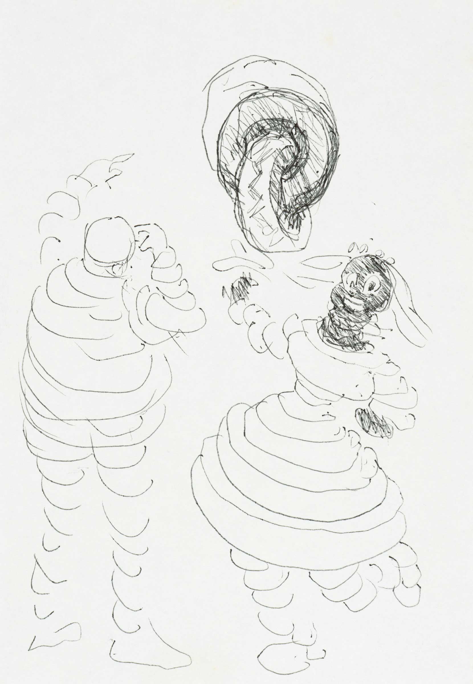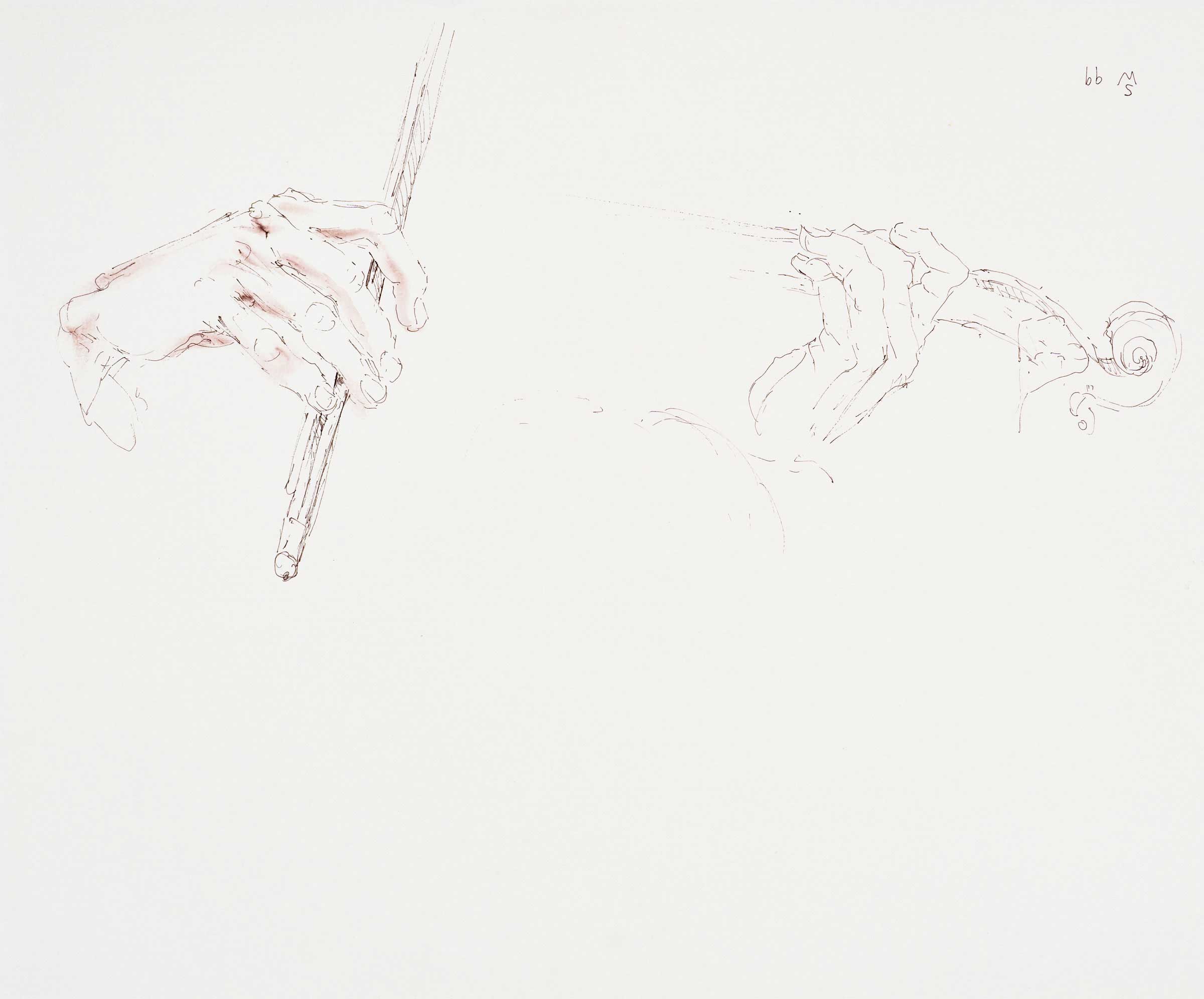 black ballpoint pen and drafting pen, brown ink