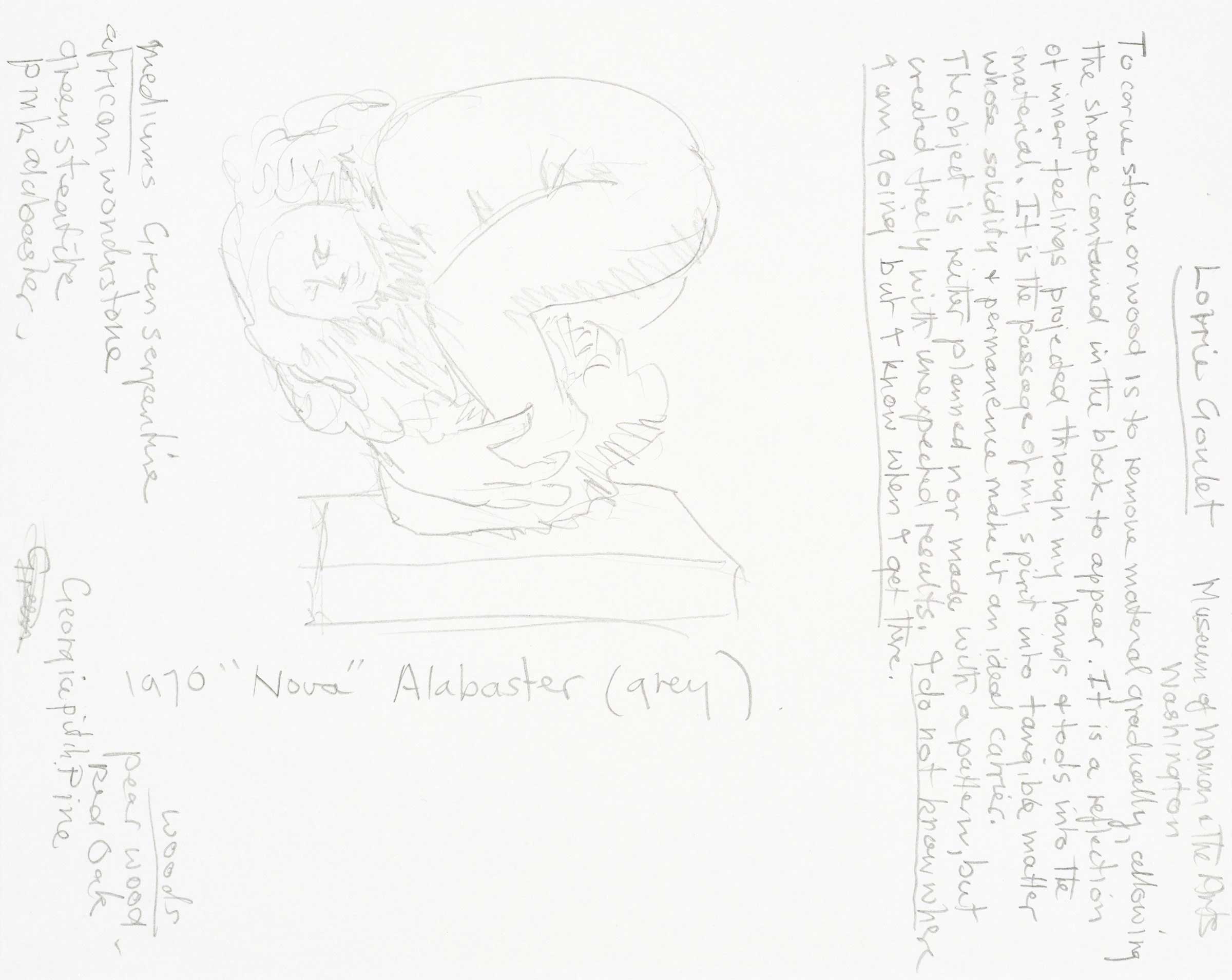 Nova, alabaster carving by Lorrie Goulet and her notes on her carving 1998